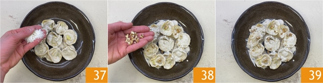 Emplatar los ravioles y completad con parmesano rallado 37 y las nueces tostadas reservadas 38. ¡Vuestros ravioles de ricotta y hierbas con salsa de nueces están listos para servirse 39!