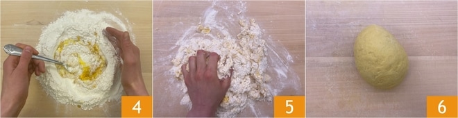 Comenzad a mezclar con un tenedor para incorporar poco a poco la harina 4, luego continuad trabajando a mano 5 hasta obtener una masa lisa y homogénea 6. Envuelve la masa en film transparente y déjala reposar en el frigorífico durante 30 minutos.