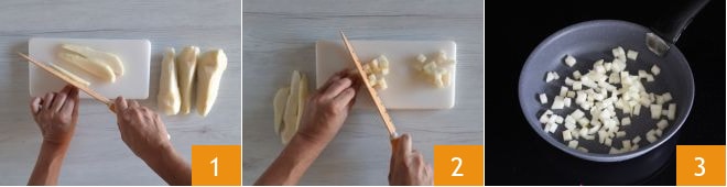 Para preparar los raviolis de trigo sarraceno con peras y taleggio, empezad preparando el relleno de los raviolis: pelad una pera, quitadle el corazón y cortadla, primero en tiras 1 y luego en cubitos muy pequeños 2. Pon los cubitos de pera en una sartén antiadherente 3 y cocínalos durante 5 minutos, dándoles vuelta a menudo.