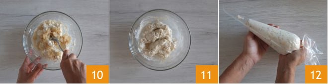 Sazonad la mezcla con pimienta negra 10 y sal fina, luego mezclad para amalgamar bien los ingredientes. Finalmente, añadid las peras 11 y mezclad. Poned el relleno en una manga pastelera y conservadlo en el frigorífico hasta el momento de usarlo 12.