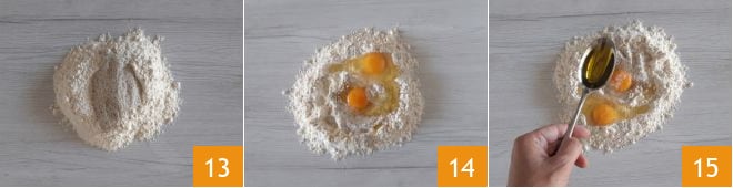 Pasad a la preparación de los raviolis: verted las dos harinas en forma de volcán sobre una superficie 13; añadid los huevos 14, la sal fina, el aceite de oliva virgen extra 15 y, con un tenedor, batid ligeramente los huevos.