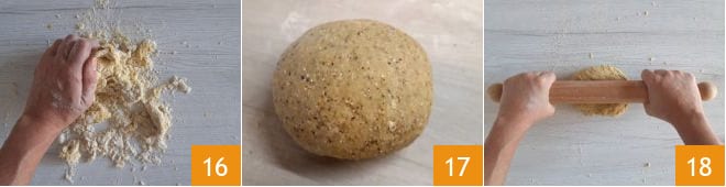 Amasad con las manos 16 hasta obtener una masa lisa y homogénea 17. Pasad a la formación de los raviolis: enharinad la superficie y extendid la masa con el rodillo 18, hasta obtener una lámina muy fina.