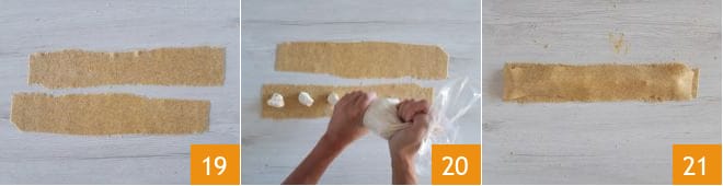 Cortad tiras de masa de unos 8 centímetros de ancho 19. Tomad el relleno de los raviolis del frigorífico; cortad la punta de la manga pastelera y, sobre una lámina, poned montoncitos de relleno, distanciados unos de otros 20. Cubrid con una tira de masa 21.