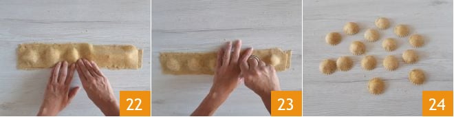 Presionad ligeramente alrededor del relleno para que las dos láminas se adhieran y para sacar el aire sobrante, evitando así que los raviolis se abran durante la cocción 22. Con un cortador redondo con borde ondulado de 6 cm de diámetro, cortad los raviolis 23. Continuad de la misma manera hasta terminar todos los ingredientes 24. Con estas cantidades obtendréis aproximadamente 24 raviolis.