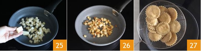 Pasad a la preparación de las peras caramelizadas para el condimento: pelad y cortad la pera en dados como antes; ponedlos en una sartén, añadid la pimienta y 10 g de mantequilla 25. Cocinad a fuego medio, hasta que los cubitos de pera estén caramelizados, dándoles vuelta a menudo. Tardarán unos 4 minutos 26. Mientras tanto, poned una olla con abundante agua con sal a calentar y, cuando esté hirviendo, cocinad los raviolis durante unos 5 minutos 27.