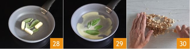 Mientras tanto, poned 3-4 hojas de salvia y los 70 g de mantequilla restantes en una sartén 28 antiadherente. Derretid completamente la mantequilla, sin dejar que hierva 29. Picad groseramente los frutos secos 30.