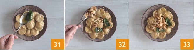 Escurrid los raviolis y condimentalos con la mantequilla y salvia 31, el granillo de frutos secos y los daditos de pera caramelizados 32. Servid inmediatamente los raviolis de trigo sarraceno con peras y taleggio 33.