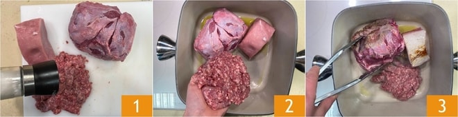 Para realizar los ravioles del plin con fondo oscuro, primero prepara el Caldo de carne que necesitarás para cocinar el relleno. Para el relleno: calienta un buen chorro de aceite en una cacerola grande, preferiblemente de hierro fundido, adecuada también para la cocción en horno. Seca la pulpa de ternera, el lomo de cerdo y la salchicha, a la que habrás quitado la tripa, luego sala ligeramente 1. Coloca la carne en la cacerola con el aceite caliente, asegurándote de compactar la pasta de salchicha con las manos para aplanarla 2. Deja dorar los pedazos de carne a fuego vivo durante 3-4 minutos sin tocarlos; cuando un lado esté bien dorado, gíralos con las pinzas de cocina y continúa de esta manera hasta que todos los lados estén bien dorados 3.