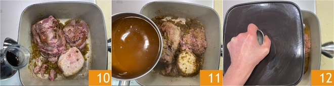 Sube ligeramente el fuego y desglasa con el vino 10. Deja hervir a fuego lento durante un par de minutos (no es necesario que el vino se evapore completamente), luego vierte el caldo de carne caliente hasta cubrir la carne aproximadamente a la mitad 11. Cubre con la tapa y transfiere al horno estático precalentado a 160° durante aproximadamente 90-120 minutos, comprobando cada media hora si es necesario agregar más caldo 12. Al final de la cocción, la carne deberá deshacerse.