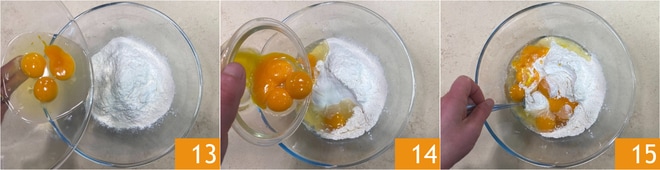 Mientras la carne se cocina, dedícate a la Pasta fresca con huevo (lámina y formatos): vierte la harina y los huevos enteros en un bol grande (o sobre una superficie de trabajo) 13, luego añade las yemas 14 y comienza a mezclar con un tenedor 15.