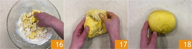 Continúa trabajando la mezcla con las manos primero en el bol 16 y luego en la superficie de trabajo 17 hasta obtener una masa lisa y de consistencia bastante firme 18. Envuelve el amasijo en film transparente y deja reposar a temperatura ambiente durante el tiempo de preparación del relleno.