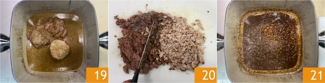 Tras el tiempo de cocción de la carne, verifica que esté lo suficientemente tierna como para deshacerse con una cuchara 19, luego transfiérela a una tabla de cortar y píquela finamente a cuchillo 20. Conserva el fondo de cocción en la cacerola y colócala de nuevo al fuego; lleva a ebullición y deja reducir hasta obtener una consistencia muy densa 21.