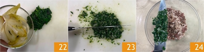 Pica finamente también las espinacas y la escarola, que habrás previamente cocido en una sartén con un chorrito de aceite (exprime las espinacas para eliminar el exceso de líquido) 22 23. Añade las verduras a la carne picada, que habrás transferido a un bol grande 24.