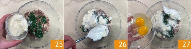 Añade también el Parmigiano Reggiano DOP rallado 25, el mascarpone 26, el huevo y la yema 27.