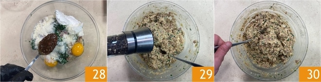 En este punto, el fondo de cocción se habrá reducido, así que viértelo en el relleno 28. Mezcla bien para amalgamar todo, luego ajusta de sal y pimienta 29. Una vez listo el relleno 30, puedes transferirlo para mayor comodidad a una manga pastelera sin boquilla.