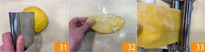 Ahora retoma el amasijo de pasta fresca y divídelo a la mitad con una rasqueta 31; envuelve una de las 2 partes con film transparente para evitar que se seque. Aplana la primera porción sobre la superficie de trabajo y espolvorea con la sémola 32, luego pásala por los rodillos de la máquina de pasta comenzando por el grosor más ancho 33. Dobla la hoja y espolvoréala nuevamente con la sémola, luego pásala nuevamente por la máquina de pasta reduciendo poco a poco el grosor.