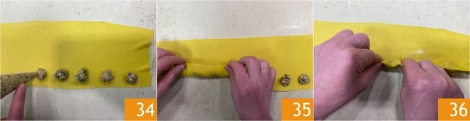 Cuando hayas obtenido una hoja de pasta de 1 mm de grosor, colócala sobre la superficie de trabajo y exprime montoncitos de relleno a unos 1 cm del borde, espaciándolos entre sí un par de cm 34. Dobla delicadamente la hoja sobre sí misma 35 y pellízcalos con los dedos a los lados del relleno para obtener la clásica forma “del plin”, asegurándote de eliminar el aire en el interior 36.