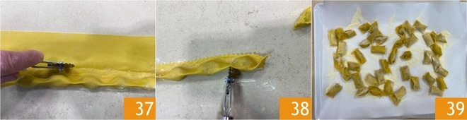 Utiliza una rueda cortapastas para recortar primero la tira de ravioles 37 y luego para separarlos individualmente 38; de esta manera se formará una especie de “bolsillo” externo que retendrá el condimento. Procede de esta manera también con la segunda porción de masa y coloca gradualmente los ravioles obtenidos sobre una bandeja espolvoreada con sémola 39.