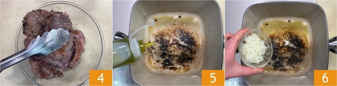 La salchicha se dorará más rápidamente, así que una vez lista, puedes retirarla de la cacerola y transferirla a un bol; a medida que los otros pedazos de carne estén bien dorados, retíralos también y resérvalos en el bol 4. En la misma cacerola, añade otro chorro de aceite al fondo de cocción 5, luego añade la cebolla picada 6.