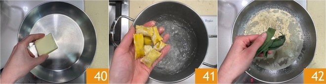 Estás listo para cocinar: lleva a ebullición una olla de agua salada, mientras tanto, coloca la mantequilla en una sartén grande y enciende el fuego medio 40. Cuando la mantequilla se haya derretido completamente, vierte los ravioles en el agua a ligero hervor 41. Tan pronto como la mantequilla haya adquirido un color ámbar, añade las hojas de salvia 42.