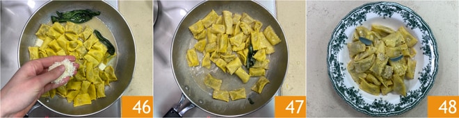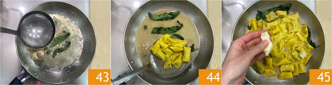 Añade también un cucharón del agua de cocción de los ravioles 43 y mezcla brevemente: de esta manera, habrás obtenido la mantequilla avellana. Cuando los ravioles suban a la superficie, escúrrelos y transfiérelos a la sartén 44, luego saltéalos durante un minuto. Apaga el fuego y manteca con la mantequilla fría 45.