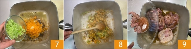 Agrega también la zanahoria y el apio picados 7, sala y sofríe raspando bien el fondo caramelizado con una cuchara de madera 8. Cuando el sofrito esté pochado, coloca nuevamente los pedazos de carne en la cacerola, junto con los jugos que hayan liberado 9.