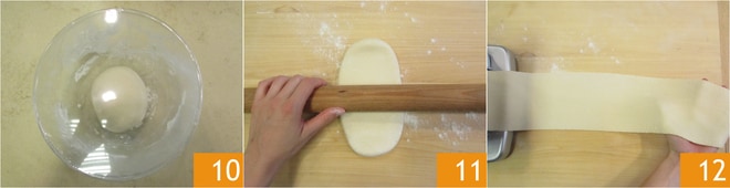 Forma una bola homogénea, cubre con film transparente y deja reposar durante 30 minutos 10. Extiende la bola primero con un rodillo 11, luego pásala por la máquina laminadora 12 para crear una lámina muy fina.