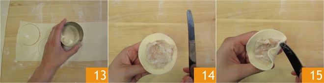 Recorta discos circulares con un vaso o un cortador de 8 cm de diámetro 13. Coloca una cucharada de relleno en el centro del disco de masa 14. Pliega los bordes con la punta de un cuchillo 15.
