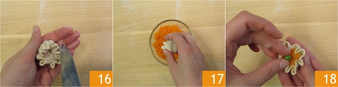 De manera que recuerden a una flor 16. Decora la superficie sumergiendo la parte superior del raviol en un cuenco con zanahorias ralladas 17. Inserta un guisante en el centro 18.
