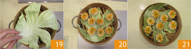 Toma una vaporera, coloca encima una hoja de col para que los ravioles no se peguen 19. Inserta los ravioles 20, cubre con la tapa y cocina durante 10-12 minutos a fuego medio. Los ravioles Shao Mai están listos para disfrutar 21.