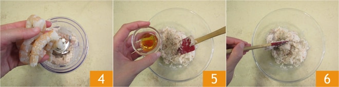 Añade también los langostinos y tritura finamente para obtener una mezcla homogénea 4. Transfiere el relleno a un bol y condimenta con sal, pimienta y vino de arroz 5. Mezcla y deja reposar 10 minutos 6.