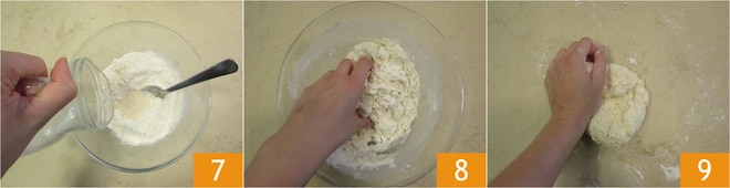 Ocupémonos de la masa: en un bol vierte la harina, el agua tibia en el centro y una pizca de sal 7, mezcla 8 y luego, cuando la masa comience a formarse, transfiere la masa a una superficie de trabajo 9.