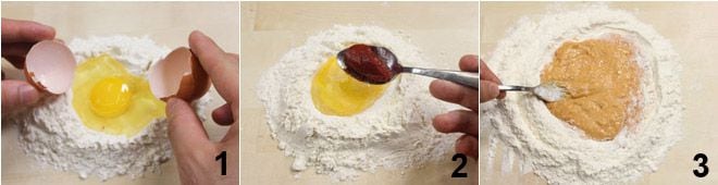 Para preparar los raviolis rojos con tomate, coloca la harina en forma de volcán sobre una superficie de trabajo y pon los huevos 1 y el concentrado de tomate 2 en el centro. Mezcla ayudándote con un tenedor incorporando la harina poco a poco 3.