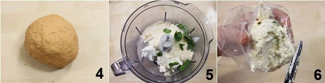 Amasa la mezcla con las manos hasta obtener una masa lisa y elástica 4. Cubre la masa con film transparente y déjala reposar en el frigorífico durante al menos 30 minutos. Mientras tanto, prepara el relleno de los raviolis rojos con tomate: pon en una batidora la ricotta, el queso rallado y la albahaca picada con las manos 5, ajusta de sal y pimienta y enciende la batidora hasta que los ingredientes estén bien mezclados, después transfiere la mezcla a una manga pastelera 6.