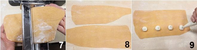 Estira la masa con la ayuda de una máquina de pasta 7, comenzando a estirarla desde el grosor más ancho, doblándola y girándola en cada pasada, hasta el más fino 8. Empareja las hojas y exprime montoncitos de relleno en un lado de la hoja 9.