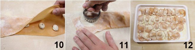 Con un pincel humedece los bordes con agua para que la pasta se adhiera bien y el ravioli no se abra durante la cocción, luego dobla la hoja y presiona ligeramente para que las dos hojas se adhieran perfectamente 10. Con un cortapastas da forma de media luna a tus raviolis rojos con tomate 11 y colócalos en una bandeja espolvoreándolos con sémola remolinada 12. Si prefieres hacerlos redondos, superpone las hojas y corta con un cortapastas.