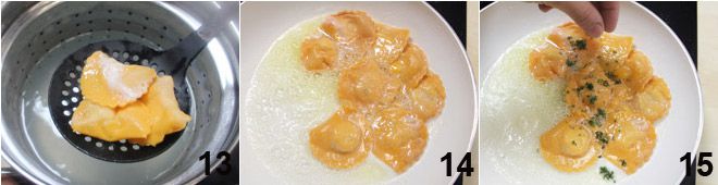 Escalda los raviolis en agua hirviendo con sal, escúrrelos y pásalos a una sartén donde habrás derretido una nuez de mantequilla (13-14). Completa espolvoreándolos con las hierbas aromáticas picadas y una pizca de pimienta negra y sírvelos calientes 15.