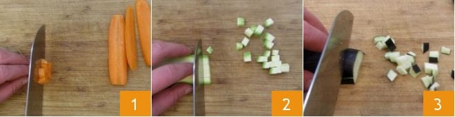 Para preparar los raviolis al vapor al estilo oriental con verduras y gambas, comenzad limpiando y cortando todos los ingredientes, manteniéndolos luego por separado. Retirad los extremos de las zanahorias, cortadlas en tiras y luego en dados 1. Proceded de la misma manera con los calabacines y las berenjenas (2-3).