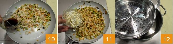 Desglasad ahora con la salsa de soja 10 y cuando se haya absorbido, terminad con los brotes de soja 11. Mezclad bien los ingredientes y dejad reposar a fuego apagado. Llevad a ebullición el agua en una vaporera, equipada con la base perforada adecuada 12.