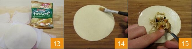 Extraed de la caja los discos de pasta 13 y, una vez retirada la película sobre la que descansan, transferidlos a la superficie de trabajo. Humedeced los bordes de un disco ayudándoos con un pincel de cocina 14, luego rellenad colocando en el centro 20/25 gr de relleno 15.