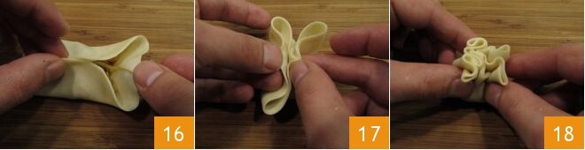 Cerrad el disco para formar el ravioli: levantad 2 bordes opuestos y selladlos juntos 16, luego llevad hacia el centro los dos bordes restantes obteniendo así un ravioli con 4 esquinas libres 17, finalmente presionad entre sí las esquinas 18 para formar un pequeño paquetito 19.