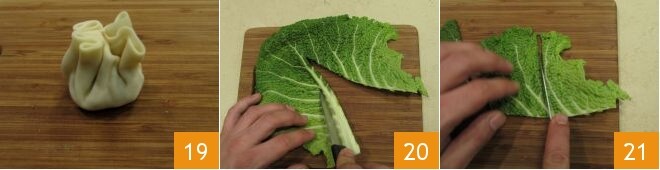Proceded de esta manera con todos los discos de pasta, para obtener 16 raviolis. Deshojad la col, lavad y secad las hojas y retirad la nervadura central 20, luego cortad las hojas para obtener 16 cuadraditos un poco más grandes que los raviolis 21: os servirán como base para no romper los raviolis una vez cocidos.