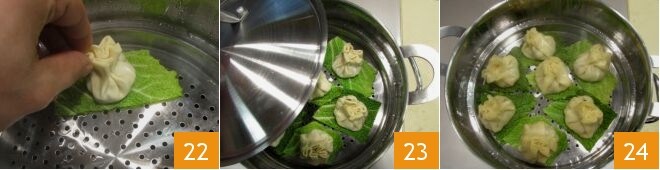 Cuando el agua de la vaporera haya alcanzado el punto de ebullición, colocad en la base perforada de la vaporera los recortes de hojas, cada uno con un ravioli encima 22. Cubrid con la tapa 23 y dejad cocer durante unos 10 minutos. Los raviolis al vapor al estilo oriental con verduras y gambas están listos 24. Servidlos enseguida.