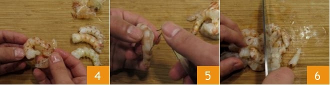Limpiad las gambas retirando completamente el caparazón 4 y, con la punta de un cuchillo o un palillo, extraed el intestino 5. Picadlas groseramente 6.