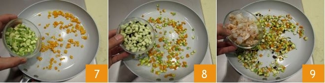 En una sartén antiadherente rociada con aceite de oliva, poned las zanahorias y cocinad por 2 minutos, luego añadid los calabacines 7. Después de otros 2 minutos de cocción, agregad las berenjenas 8 y finalmente las gambas 9: ajustad de sal, pimienta y continuad la cocción durante 3 minutos.