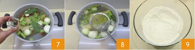 Aromatizad también con la pimienta en grano 7. Coced a fuego muy bajo durante aproximadamente 3 horas: el capón al final de la cocción deberá resultar tierno. Recordad seguir espumando el caldo ayudándoos de una espumadera 8. Mientras el capón se cuece, dedicad tiempo a la preparación de la pasta fresca: en un tazón amplio verted la harina 9.