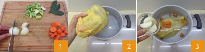 Para preparar los ravioles con caldo de capón, empezad por la preparación del caldo. Tomad las zanahorias, peladlas y cortadlas en trozos; después de limpiar la cebolla, cortadla también a trozos junto con el apio 1. Ahora tomad una cacerola con fondo antiadherente y bordes altos: verted abundante agua y añadid el capón limpio (y eventualmente flameado si presenta demasiado plumón). El agua deberá cubrir totalmente el capón. Añadid también zanahorias y cebollas 3.