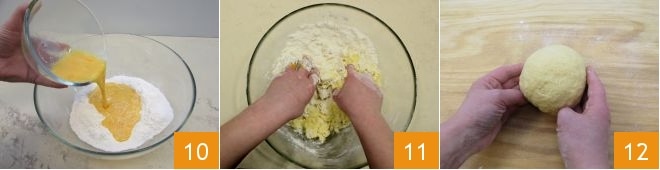 Romped los huevos a temperatura ambiente con un tenedor y vertedlos en el tazón 10: amasad los ingredientes con las manos 11, si preferís podéis usar un tenedor, hasta crear una mezcla homogénea a la que le daréis una forma esférica 12. La masa deberá ser suficientemente elástica: si resultara demasiado dura y difícil de trabajar, podéis añadir un poco de agua tibia; si resultara demasiado pegajosa, añadid más harina, sin exagerar para no obtener el efecto contrario. Envolved la masa obtenida en un papel film transparente y dejadla reposar a temperatura ambiente alejada de corrientes de aire, durante al menos 30 minutos.