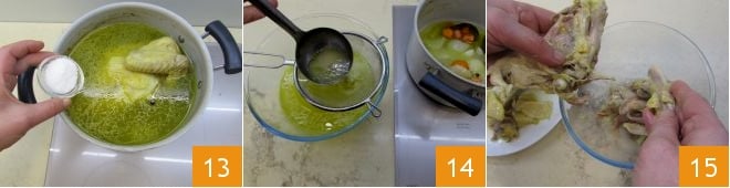 En este punto, el capón estará casi cocido: a diez minutos del final de la cocción ajustad de sal 13. La adición de sal al final de la cocción permitirá ajustar mejor la salinidad del caldo. Cuando hayáis terminado la cocción del caldo, filtradlo con un colador de malla fina 14 y reservad. Tomad el capón y deshuesadlo 15.