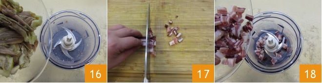 Poned la carne en una picadora y trituradla 16. Tomad el beicon ahumado, cortadlo en tiras y luego en cubos 17 que verteréis en la picadora y trituraréis 18.